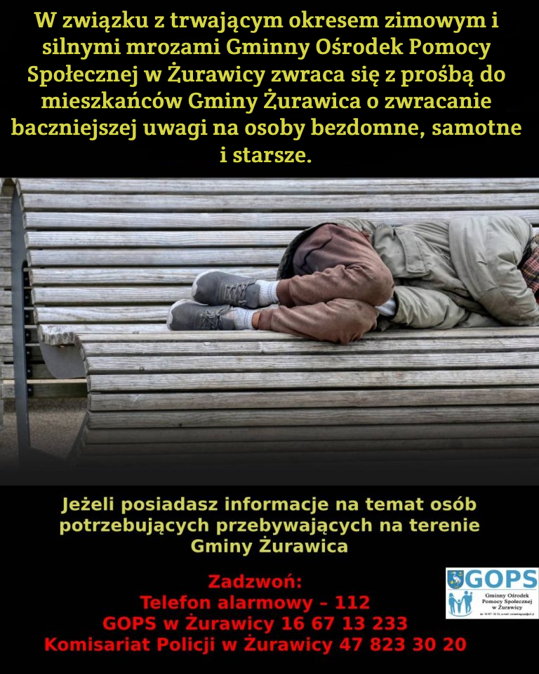 W przypadku uzyskania informacji o osobach potrzebujących pomocy na terenie Gminy Żurawica prosimy o pilny kontakt: